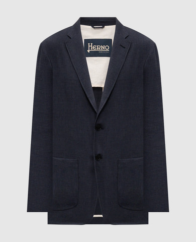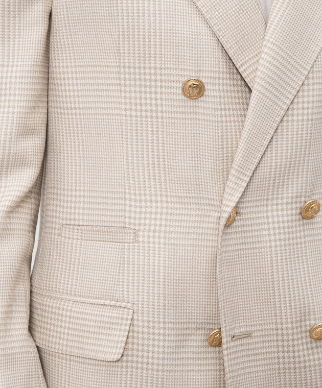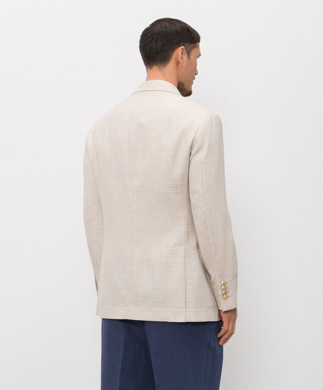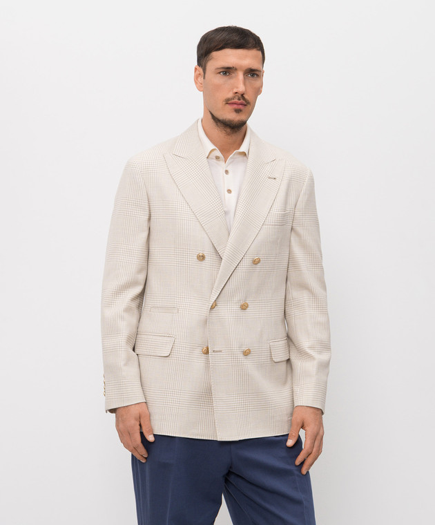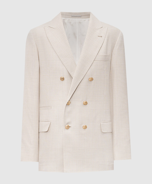 Бежевый двубортный блейзер из шерсти, шелка и льна
