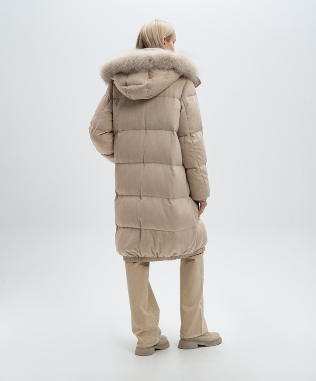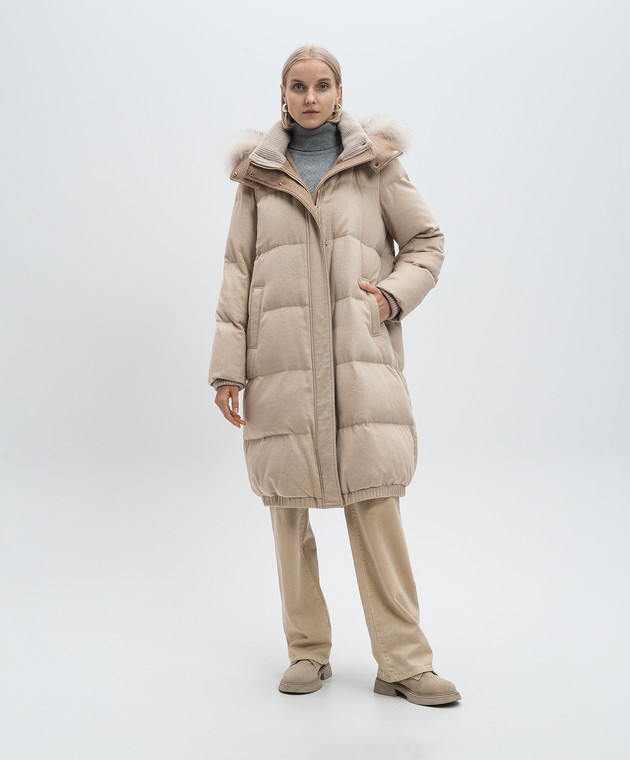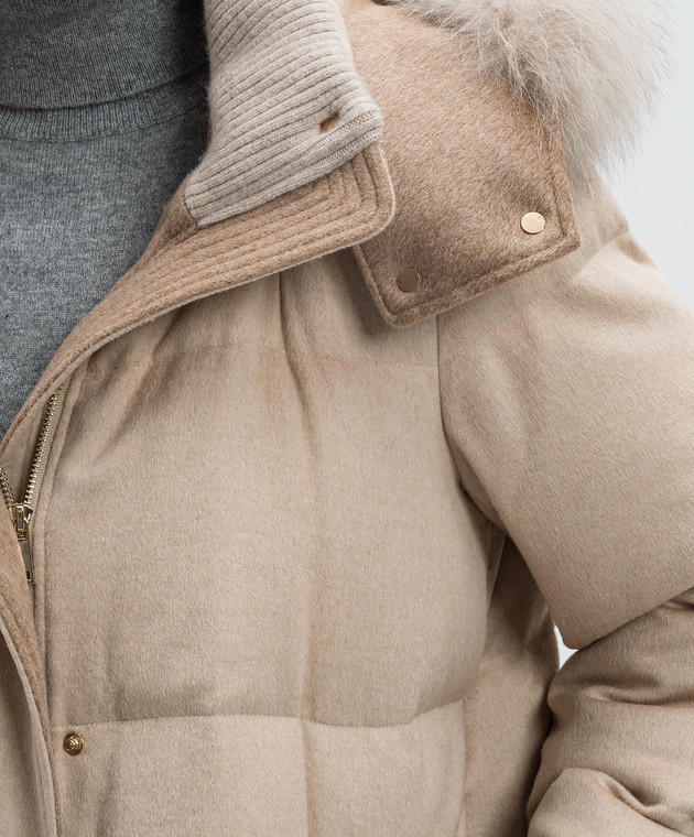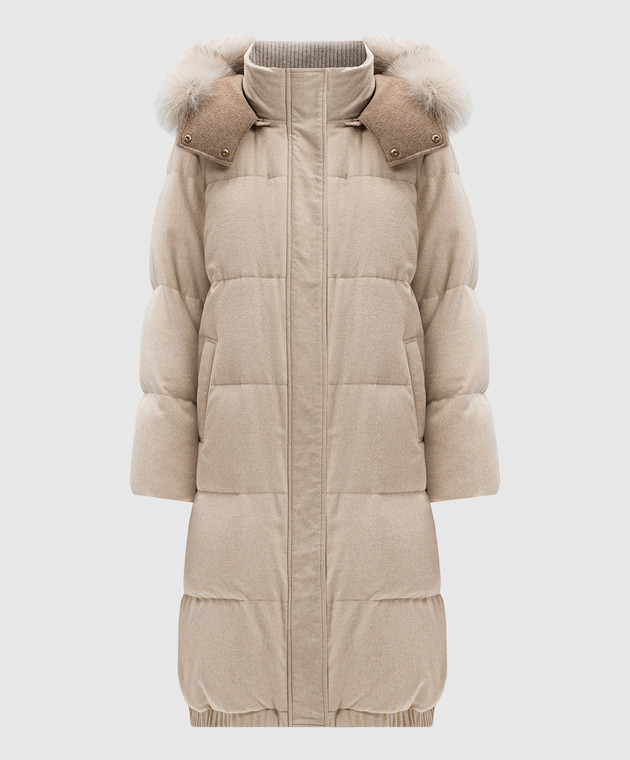 Бежевый пуховик из шелка и шерсти верблюда с мехом лисы