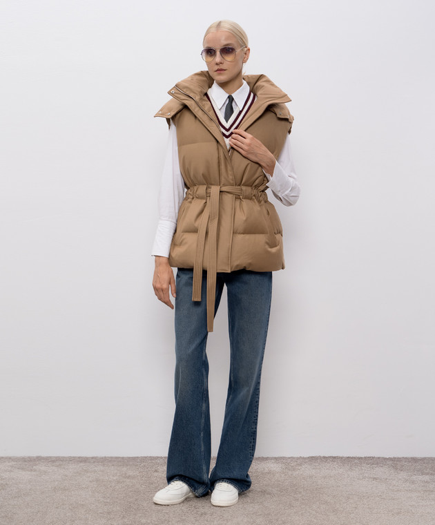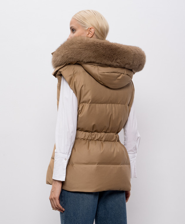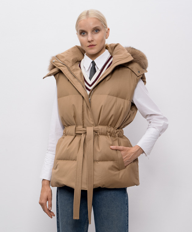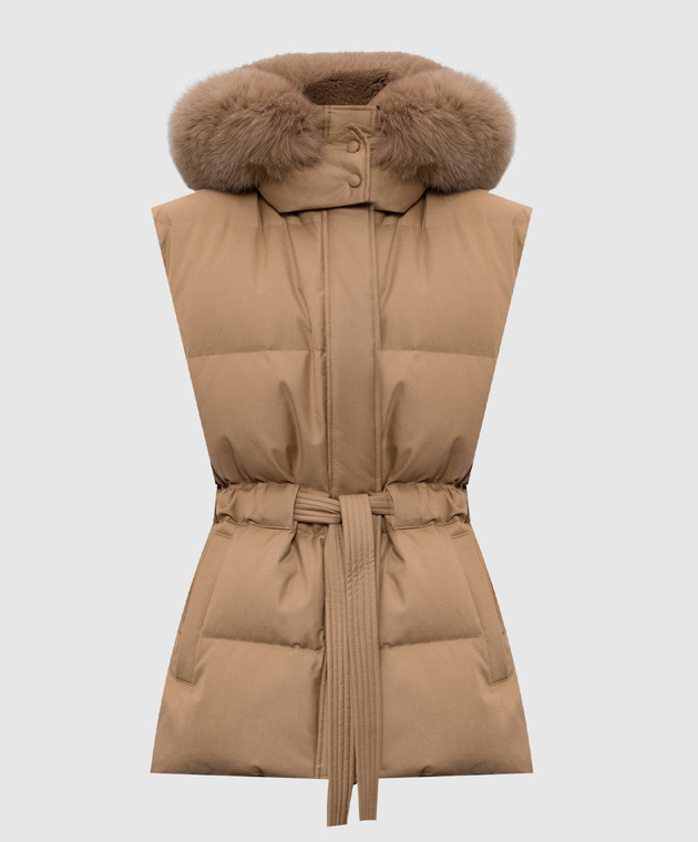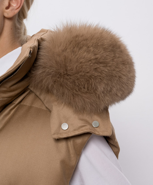 Бежевый пуховый жилет из шерсти и шелка с мехом лисы