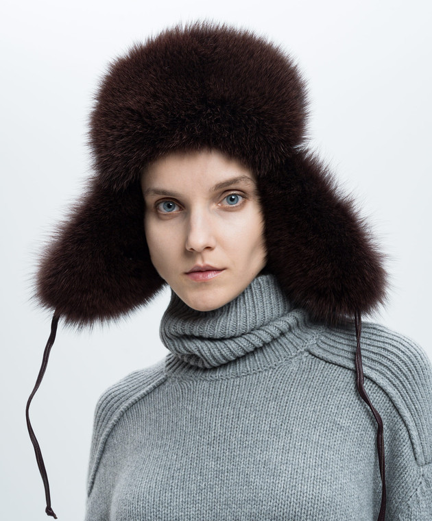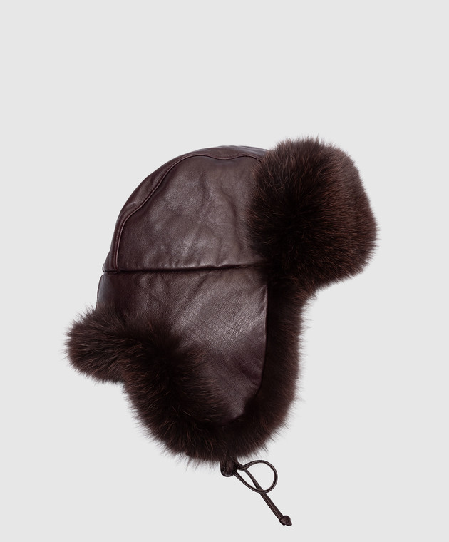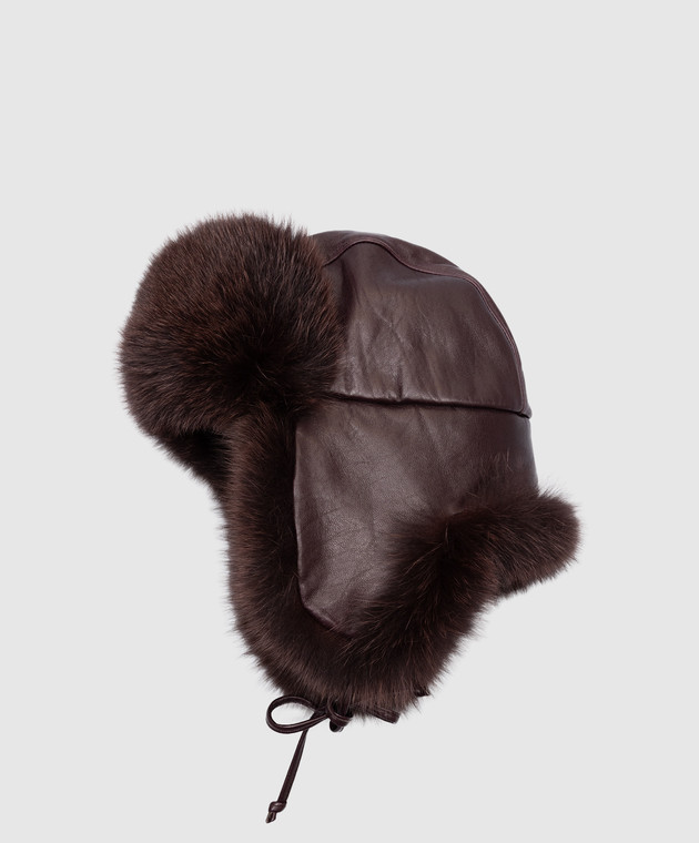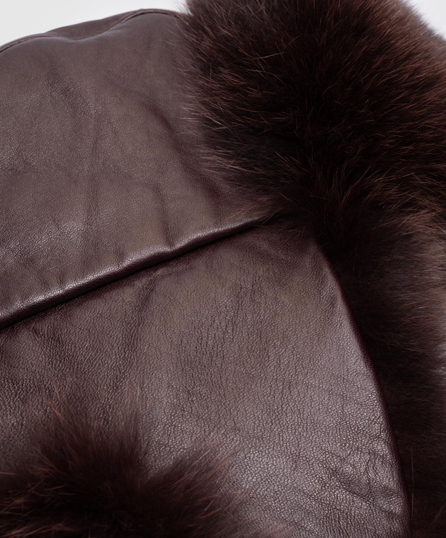 Бордовая кожаная шапка-ушанка с мехом лисы