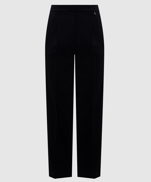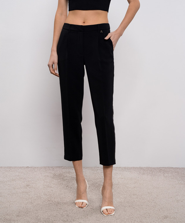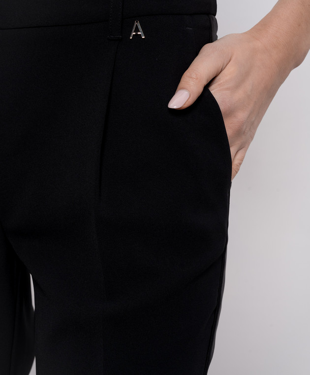 • Декор: сочетание матовой и блестящей текстур, защипы, лампасы, металлическая монограмма А, имитация задних карманов