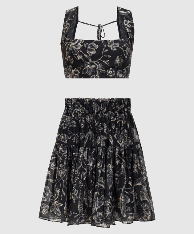 Черный костюм из топа и юбки с леном с цветочным принтом