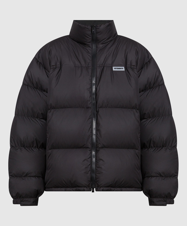 Черный пуховик с простежкой в виде горизонтальных полос