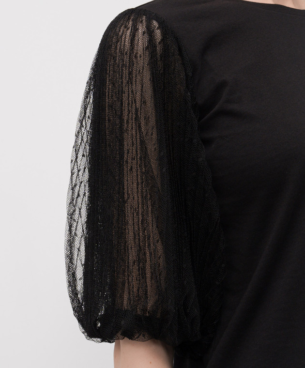 • Декор рукава-фонарики, узор горох, гофре, металлический логотип Oval T