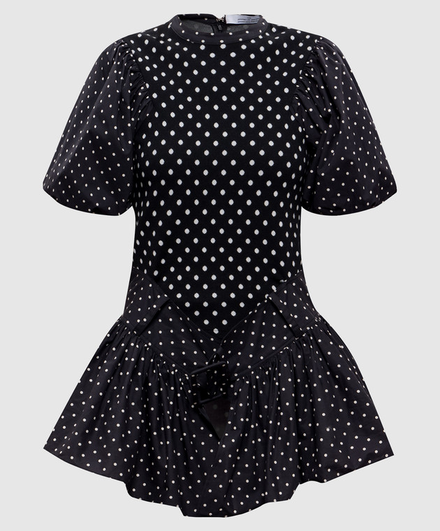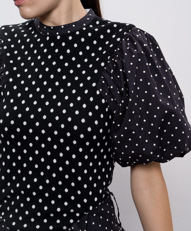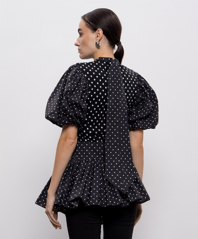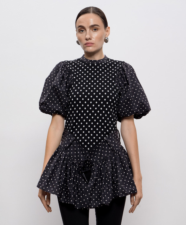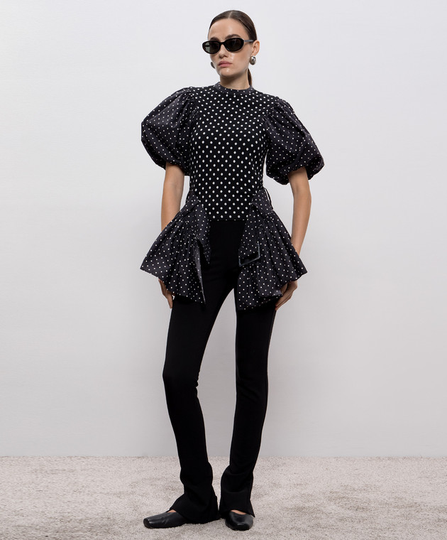 • Декор узор горошек, рукава-фонарики, драпировки, асимметричный низ, воротник-аскот, баска
