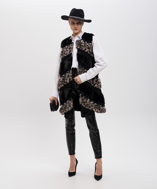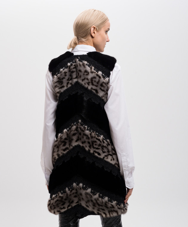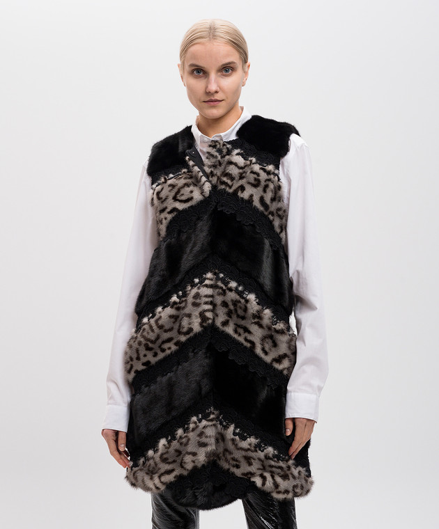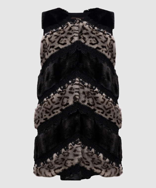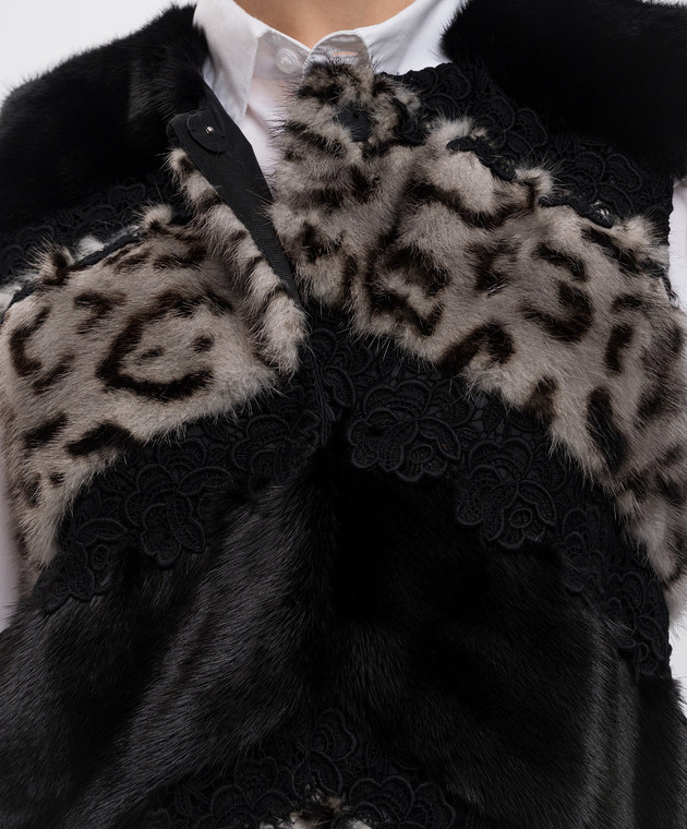 Черный жилет из меха норки в анималистичный принт с кружевом