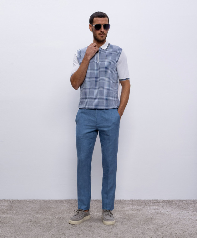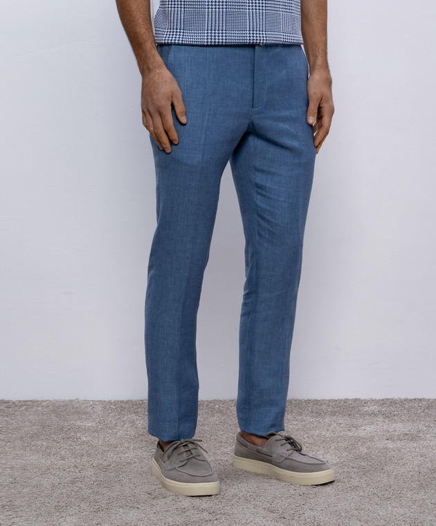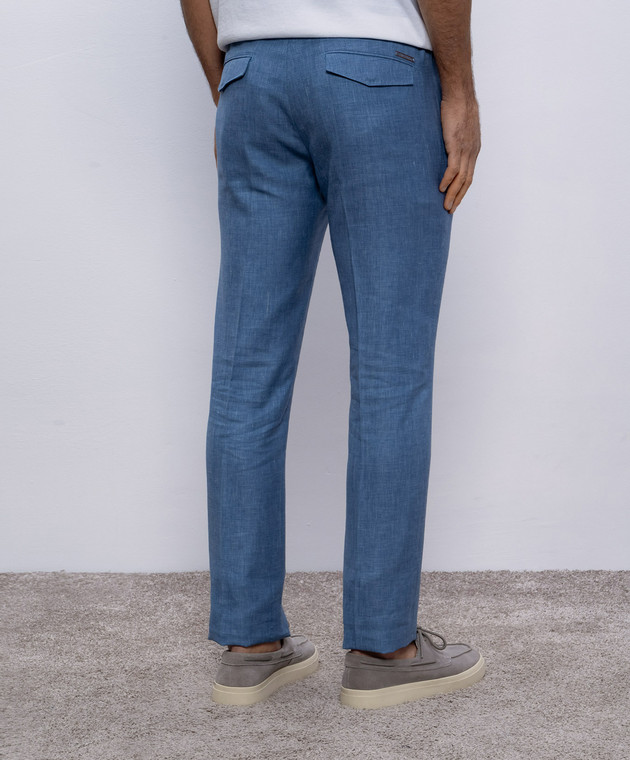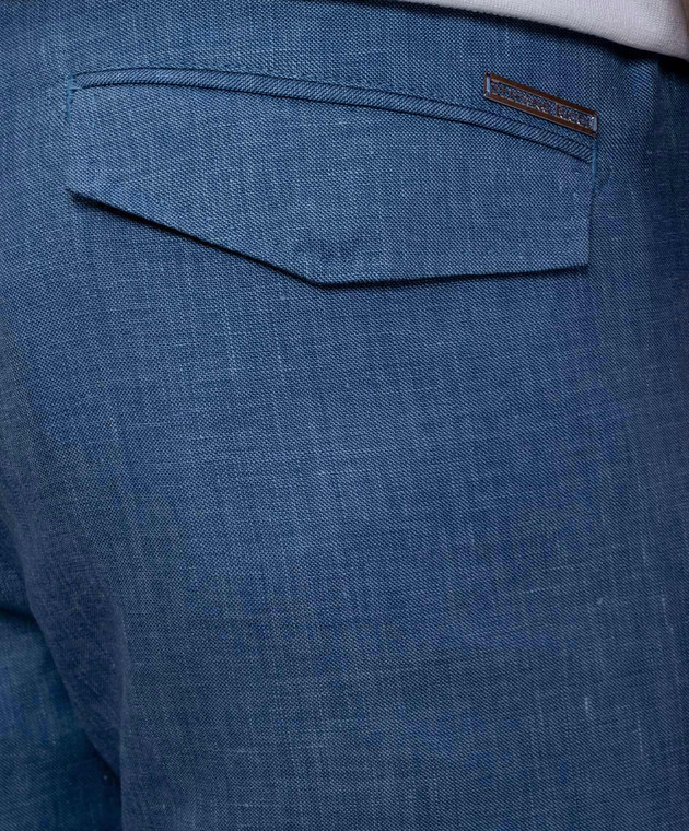 Голубые брюки из льна, шерсти и шелка с логотипом