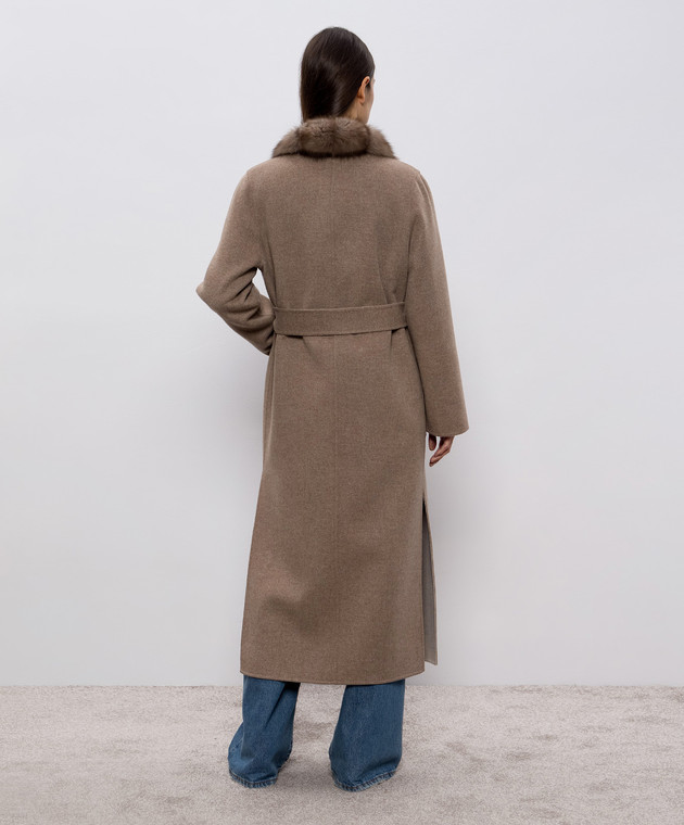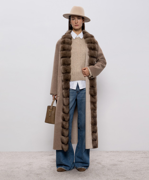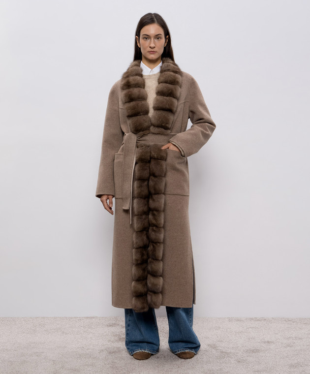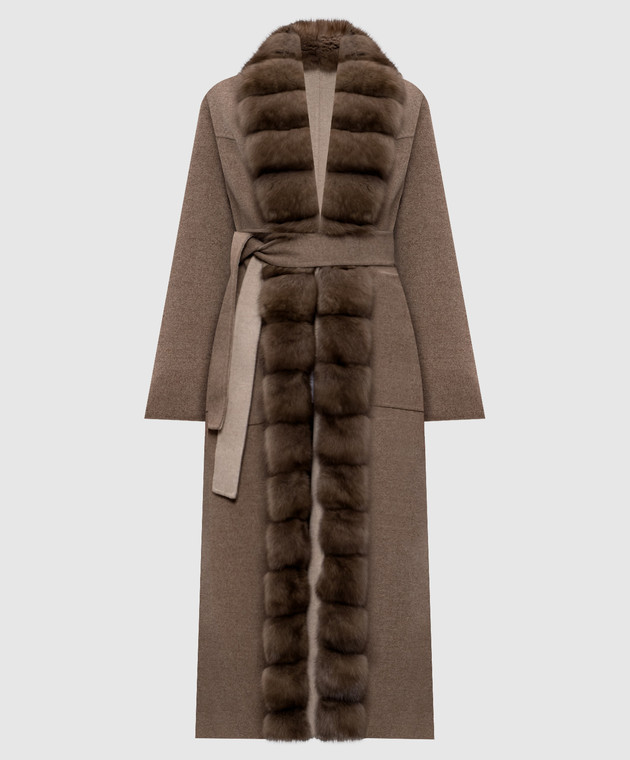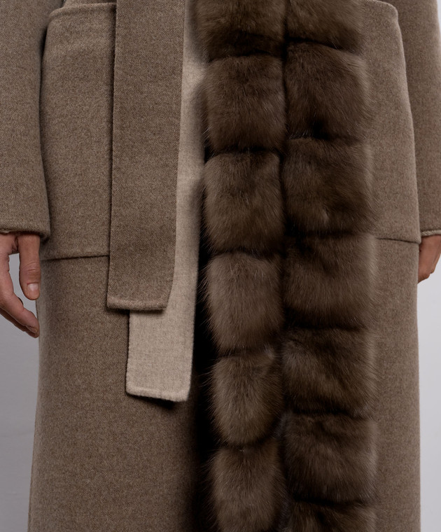 Коричневое пальто на запах из шерсти и кашемира с мехом соболя