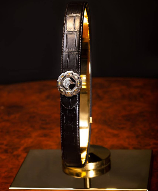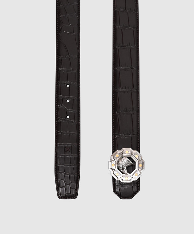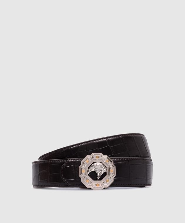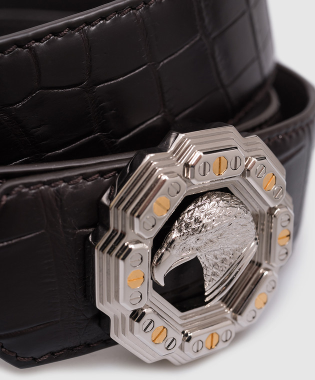 Коричневый ремень из кожи крокодила с металлической эмблемой логотипа