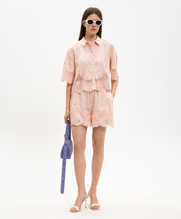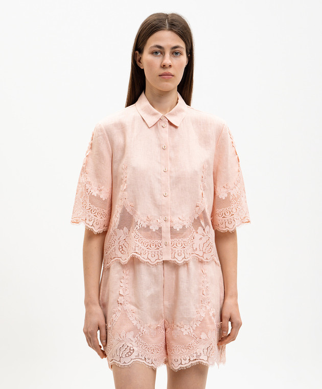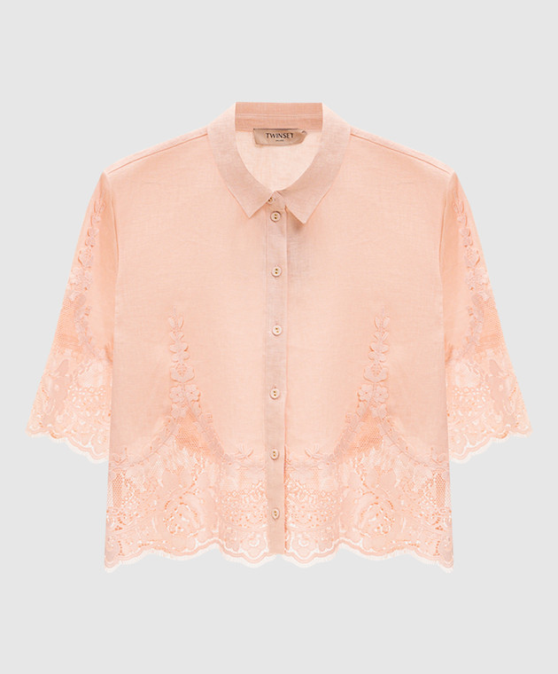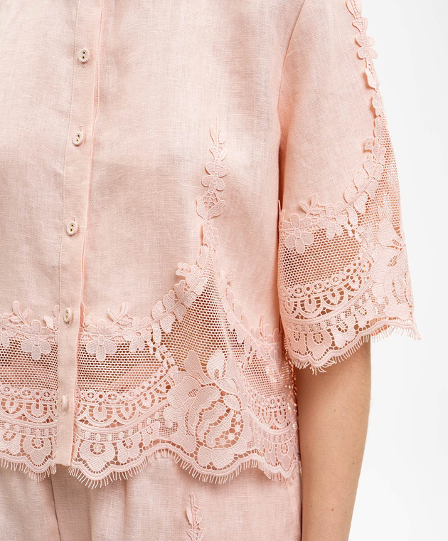 Розовая укороченная блуза из льна с кружевом
