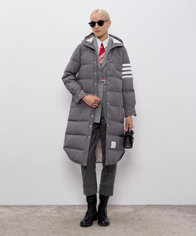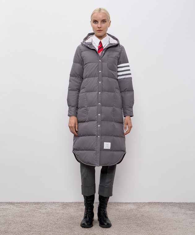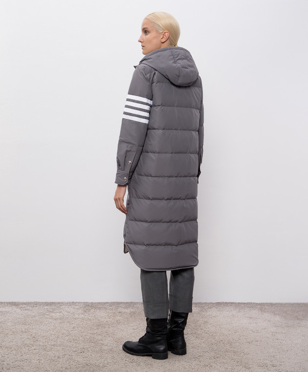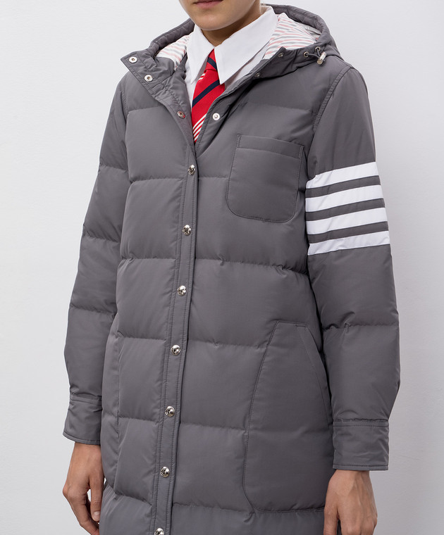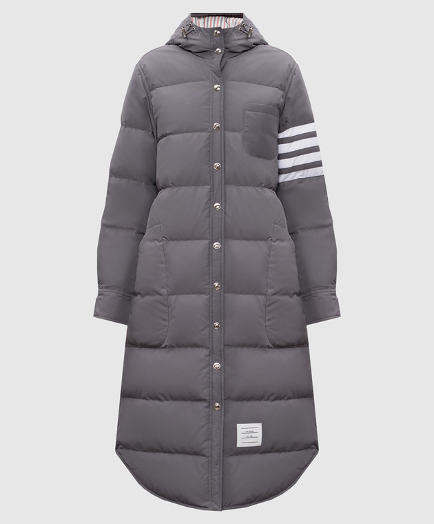 Серый стеганый пуховик с брендовыми полосками