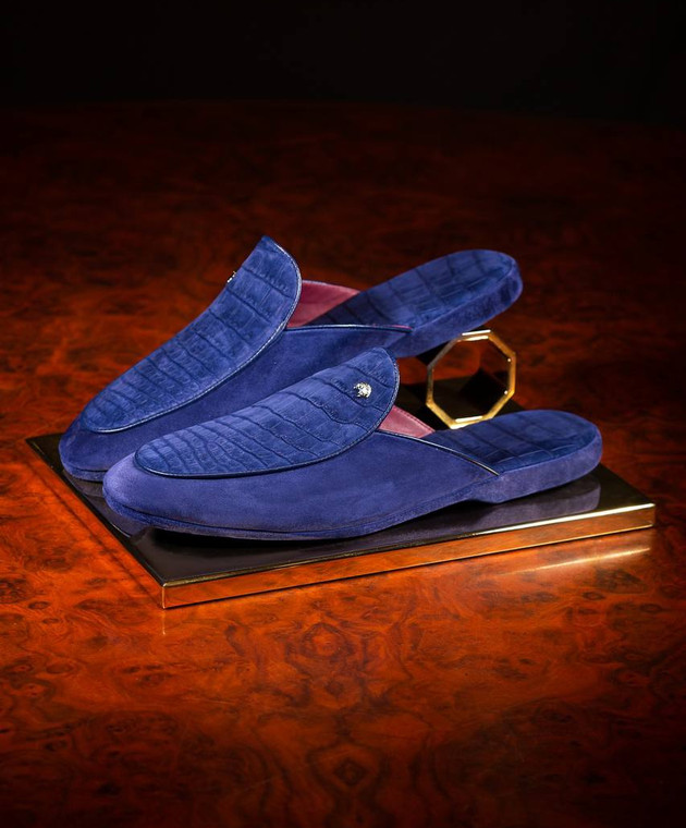 Синие замшевые домашние тапочки с кожей крокодила