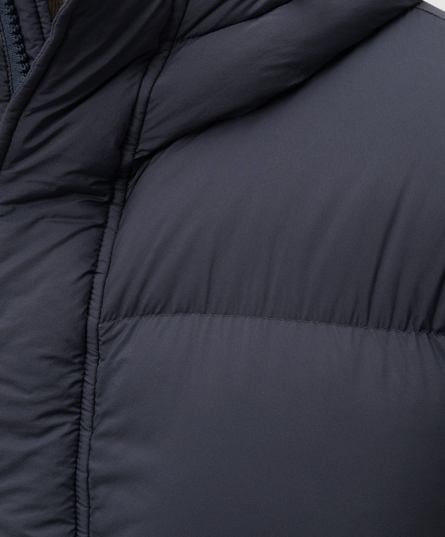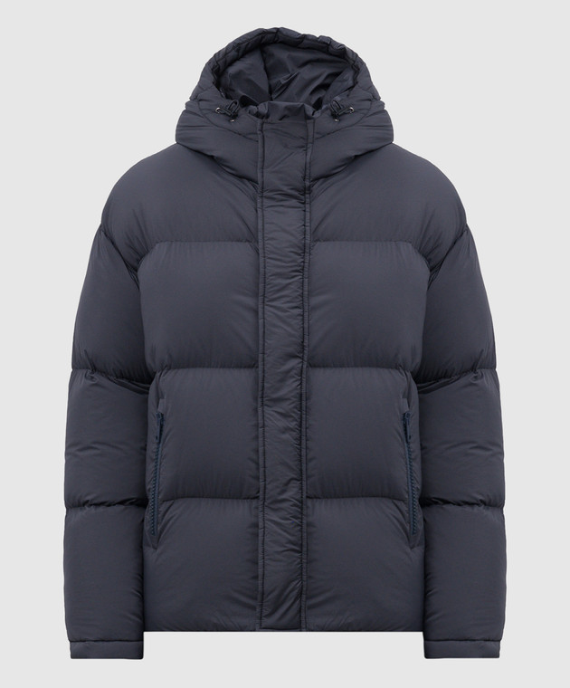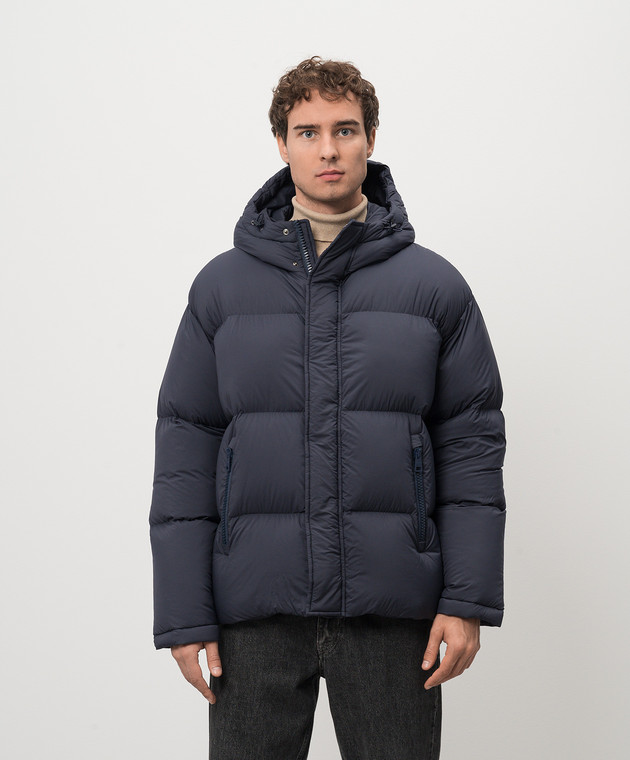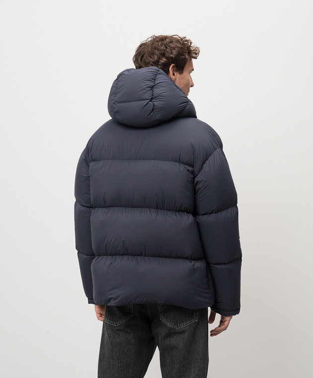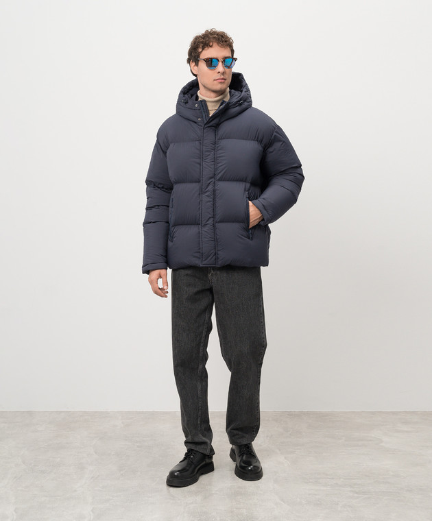 Синий пуховик с металлическим логотипом