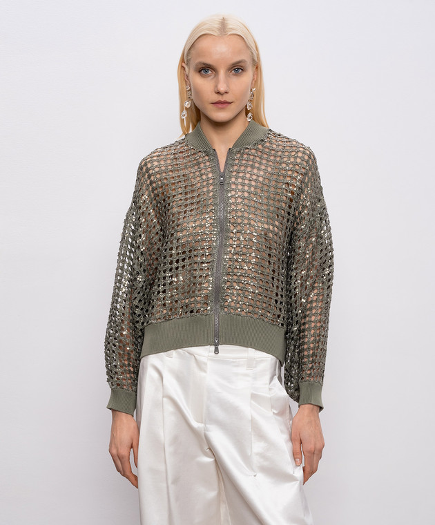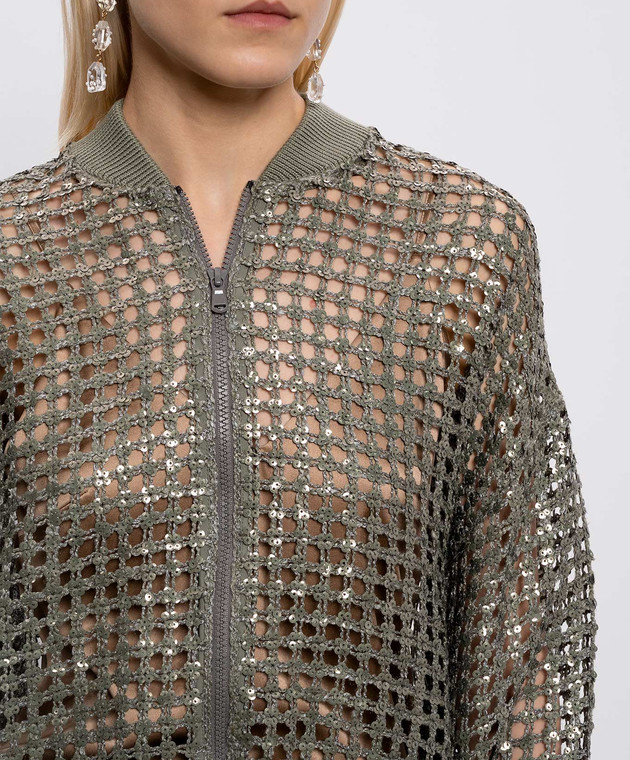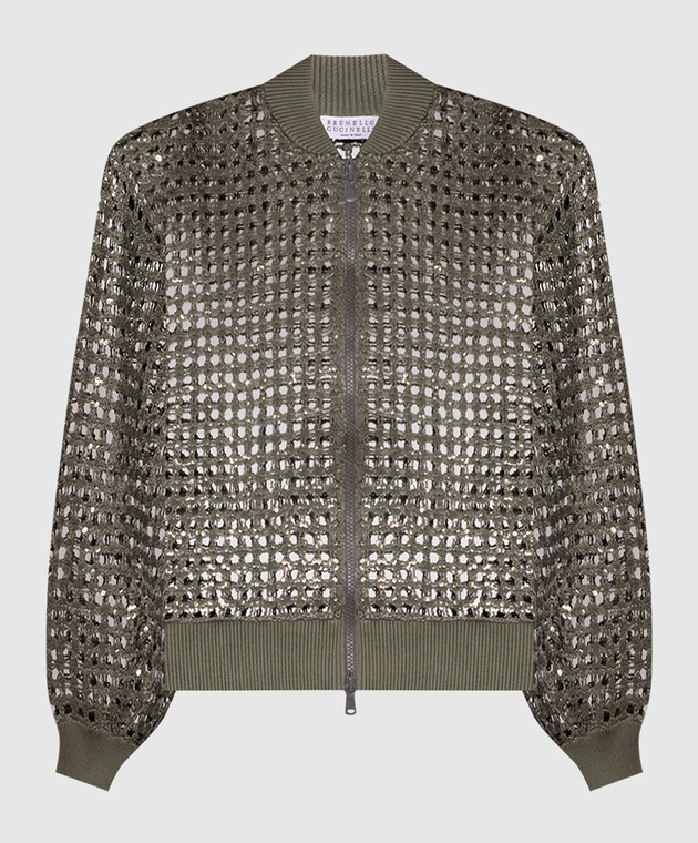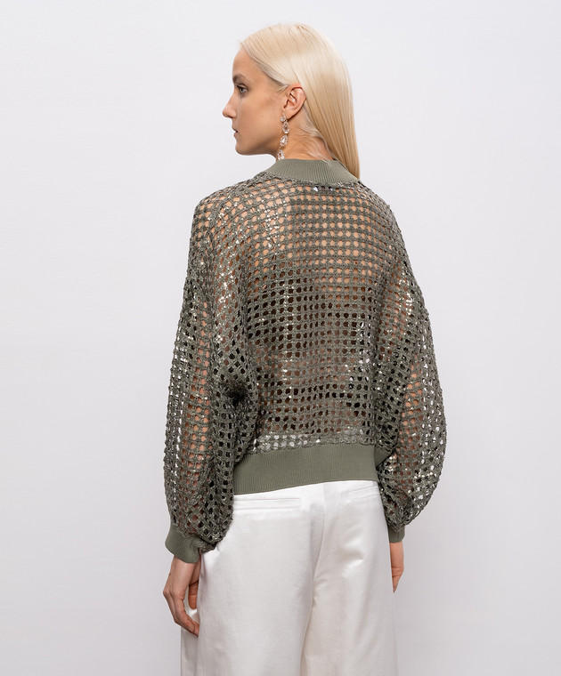 Ажурний кардиган кольору хакі із шовку та льону в паєтки