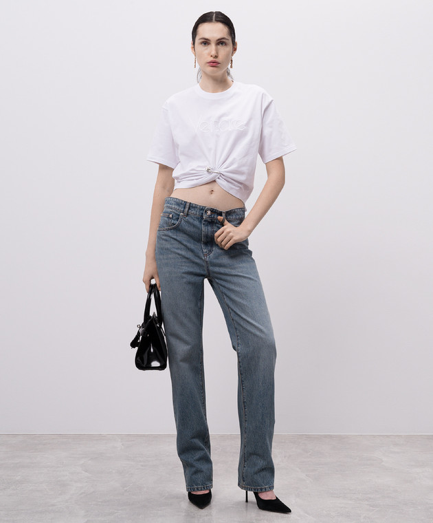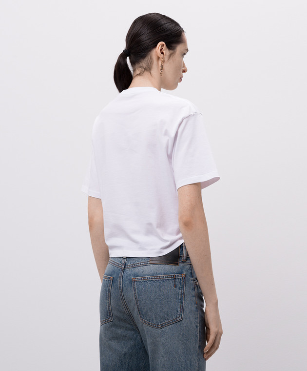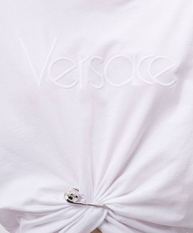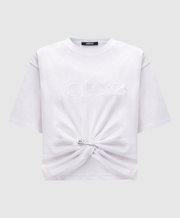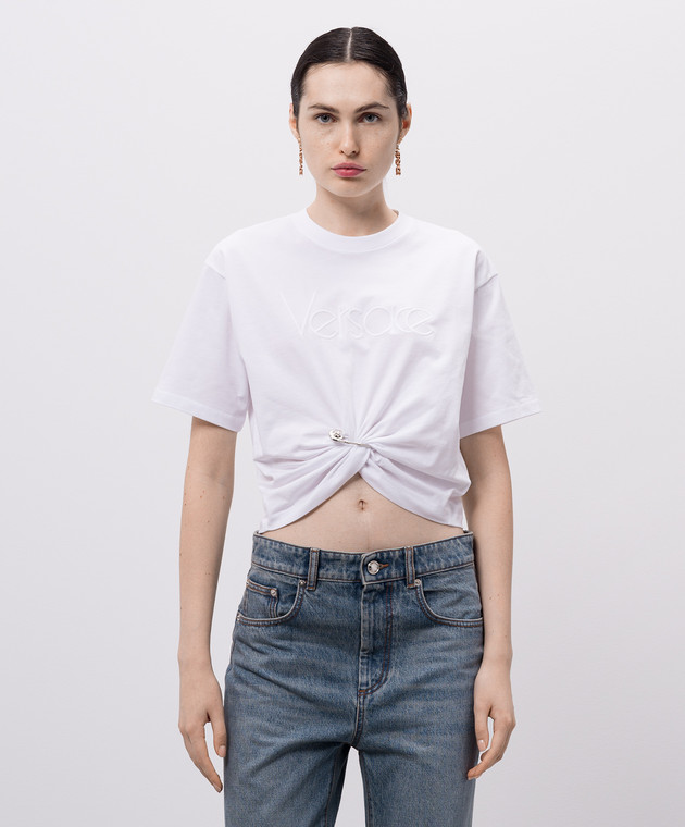 Біла укорочена футболка з логотипом та брендовою шпилькою