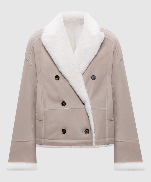 Бежева шкіряна укорочена двобортна дублянка на овчині