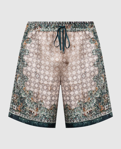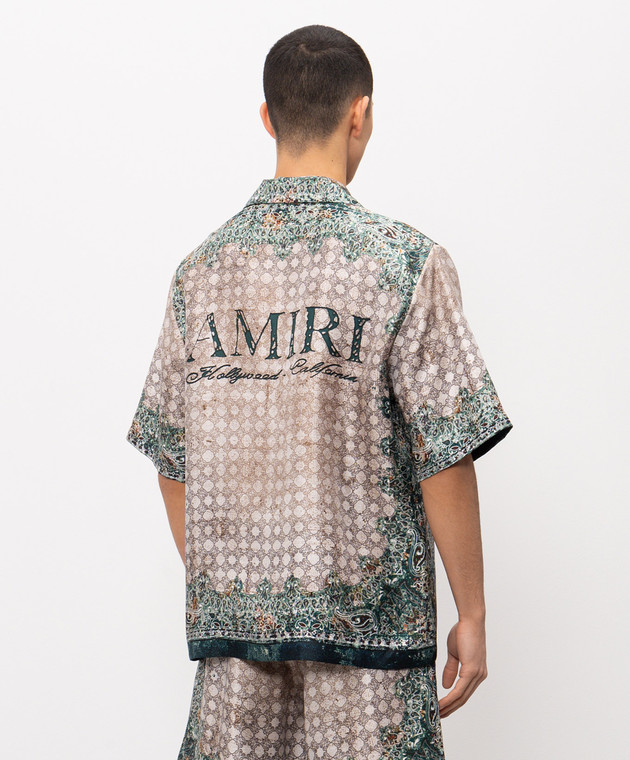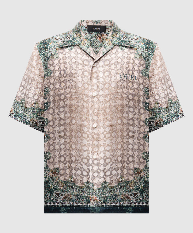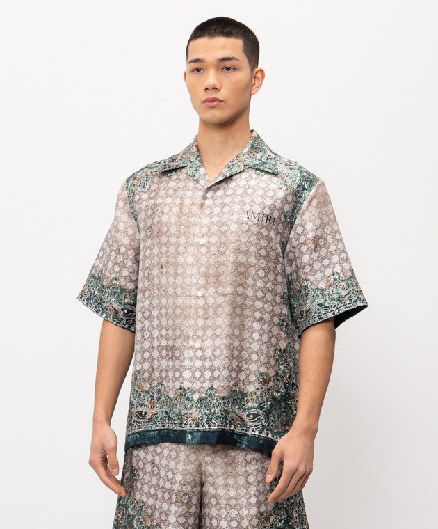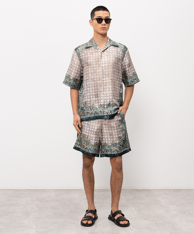 Бежева сорочка із шовку в брендовий принт