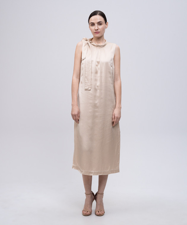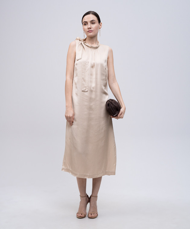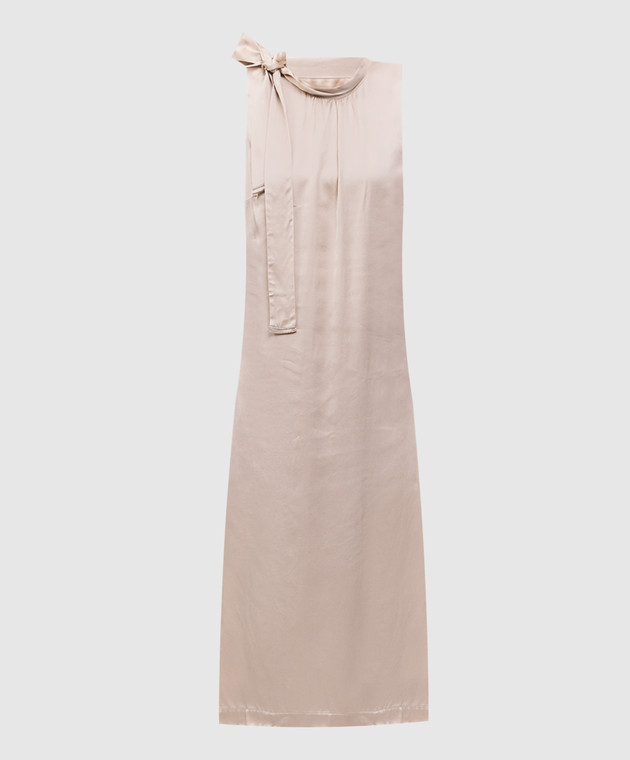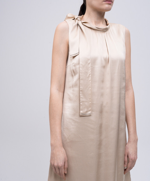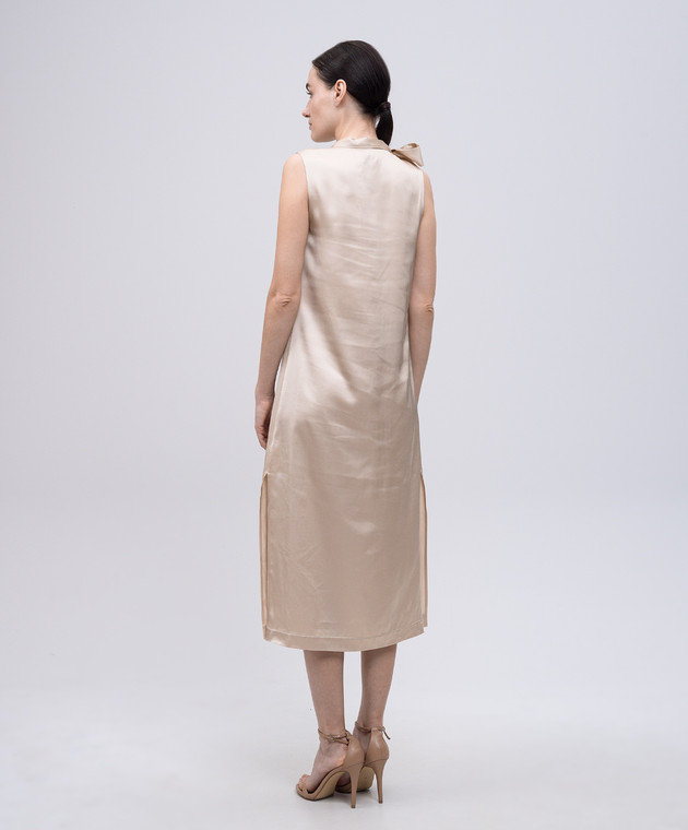 • Декор комір-аскот, ланцюжок моніль, розрізи в бокових швах, драпірування, блискуча текстура
