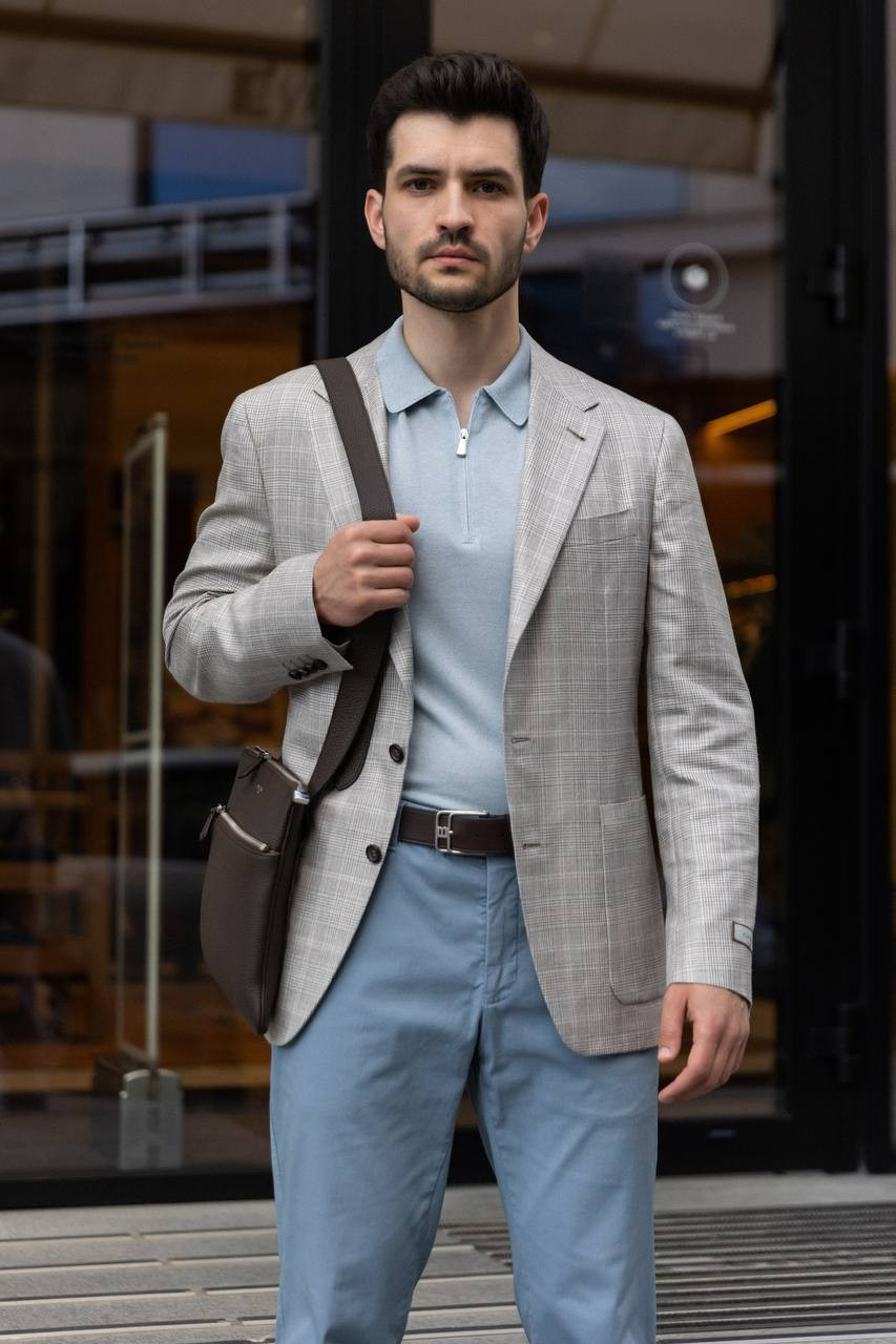 Бежевий піджак з вовни, шовку і льону в клітинку