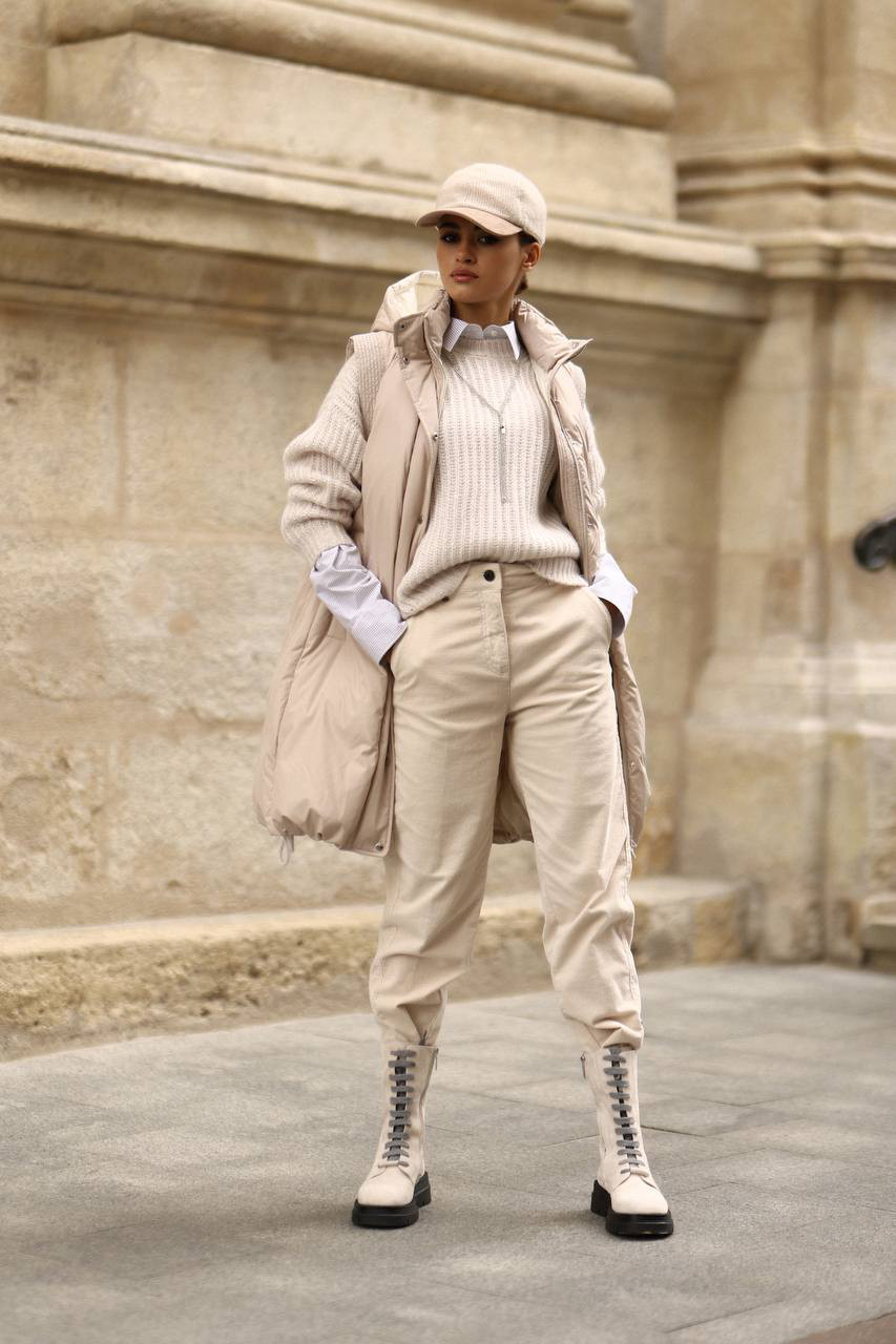 Бежевий пуховий жилет з ланцюжком моніль