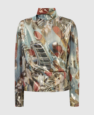 • Декор принт, люрекс, виріз на спині, драпірування, акцентні плечі, комір-аскот