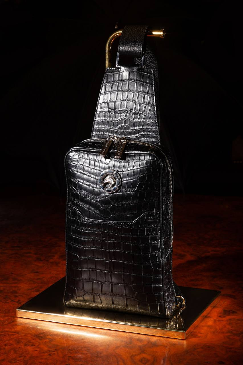 Чорна сумка-слінг зі шкіри крокодила з логотипом