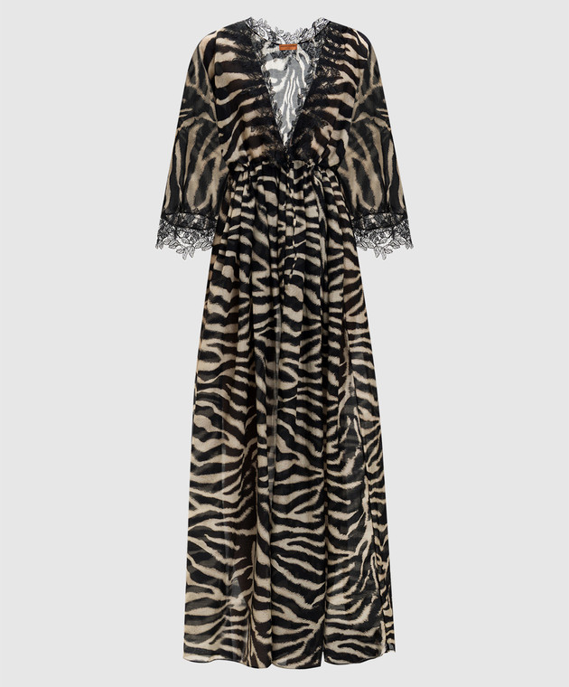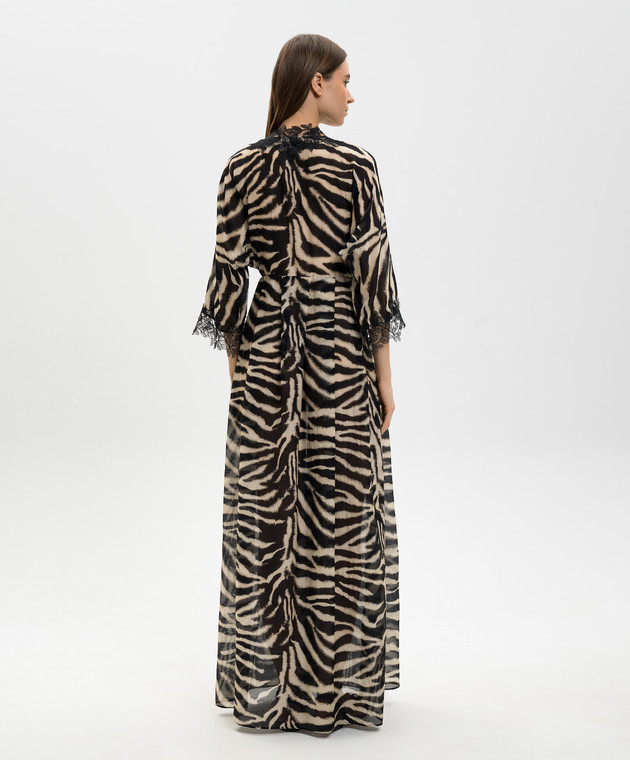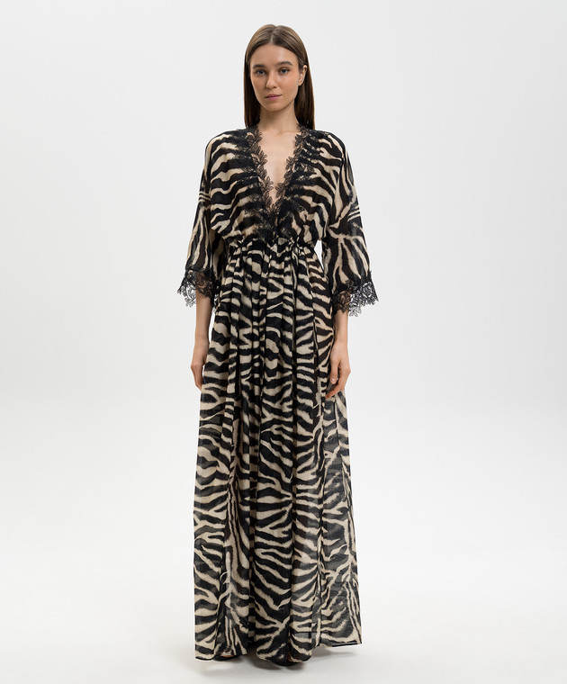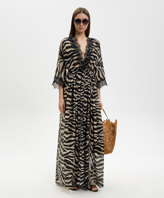 Чорна сукня-кімоно максі в анімалістичний принт з мереживом