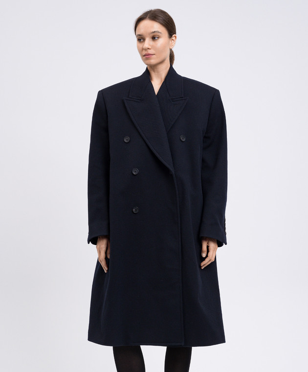 Синє двобортне пальто з вовною