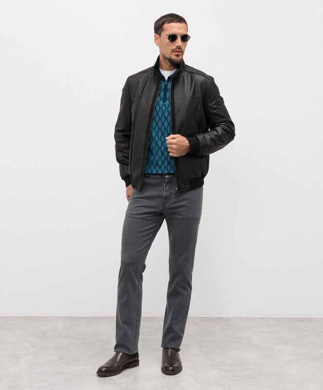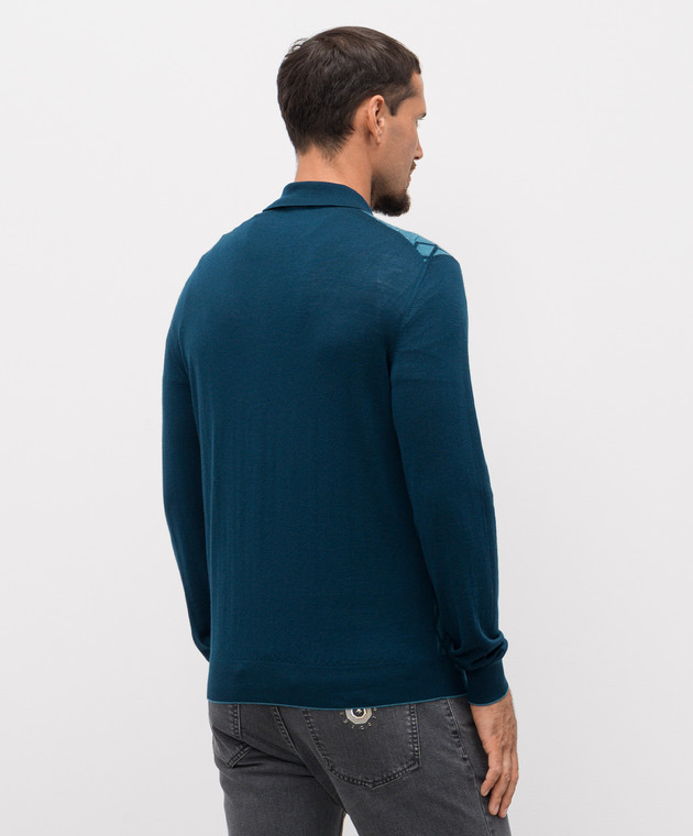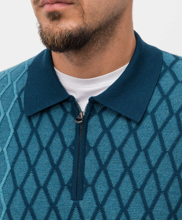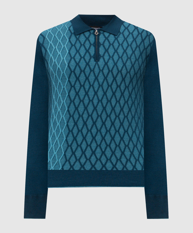 Синє поло з вовни, кашеміру та шовку у геометричний візерунок