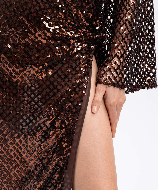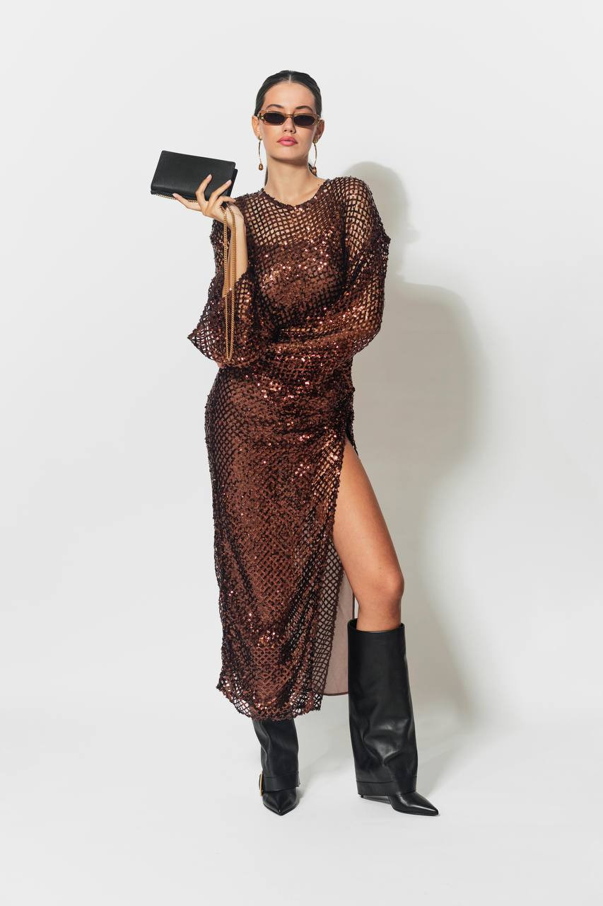 • Декор паєтки, фігурний розріз, нашивка логотипа, драпірування