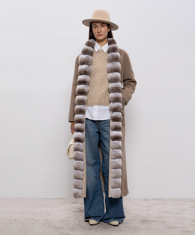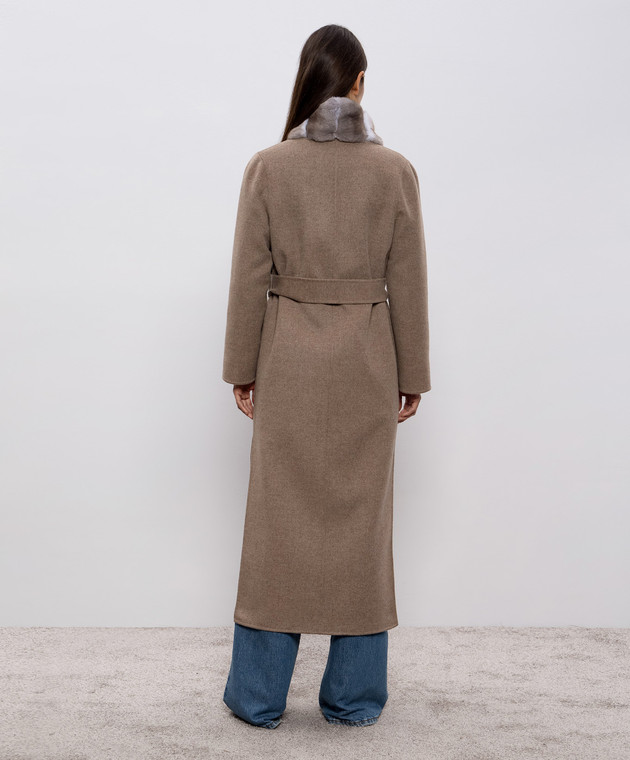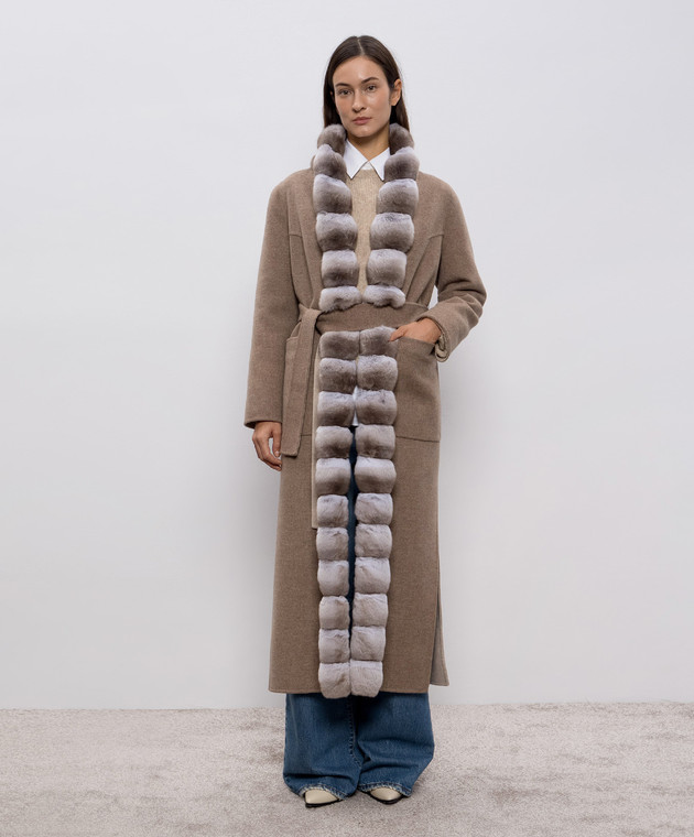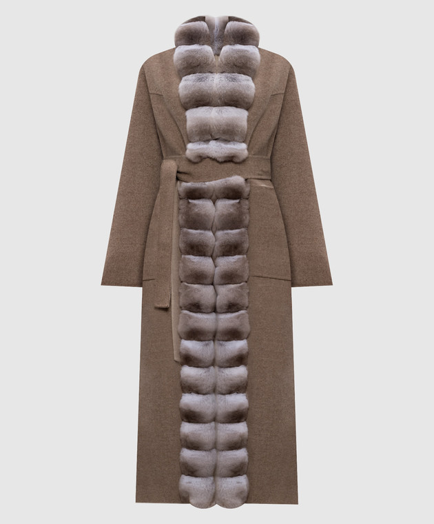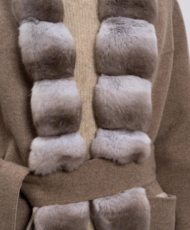Коричневе пальто на запах з кашеміру та вовни з хутром шиншили