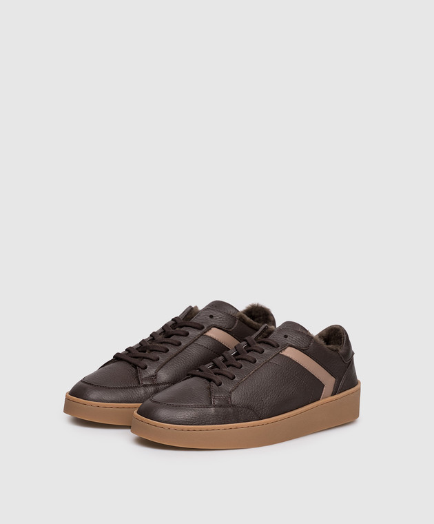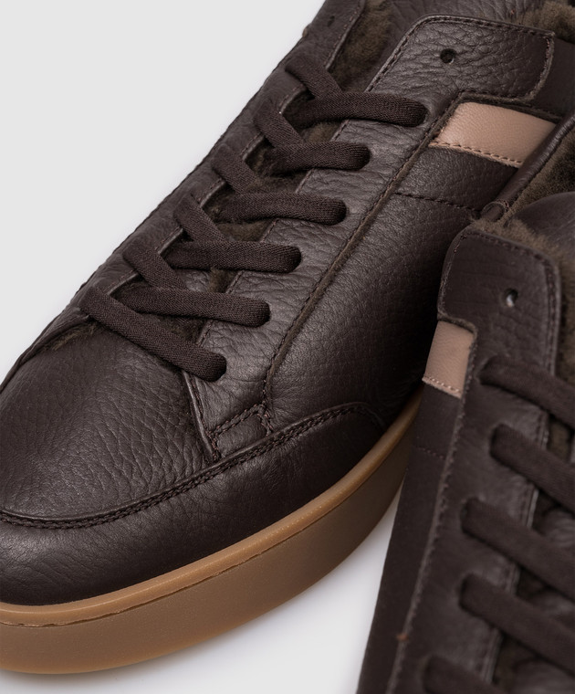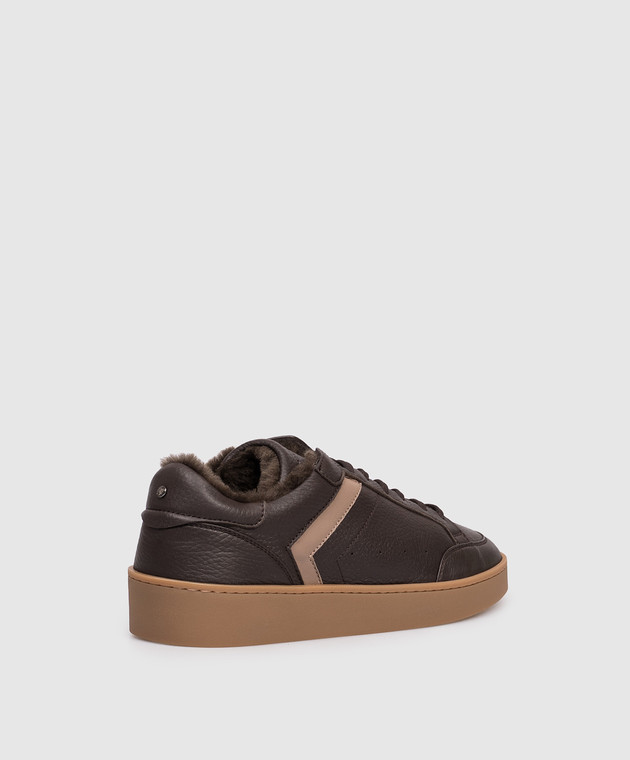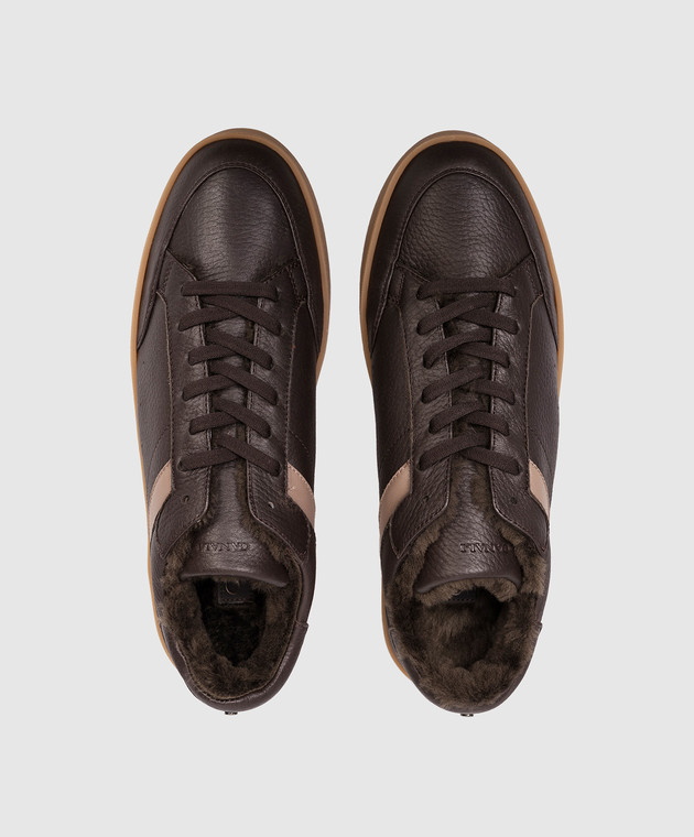 Коричневі шкіряні кросівки на хутрі з логотипом
