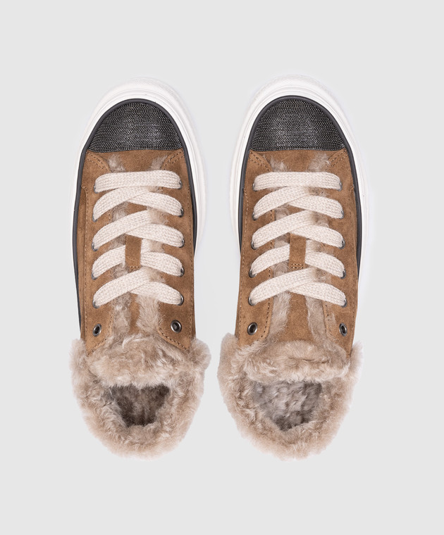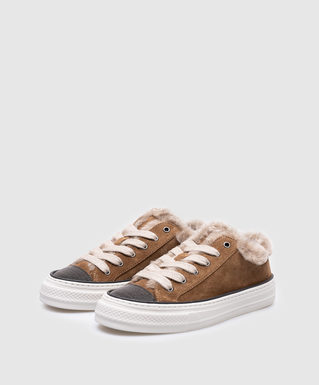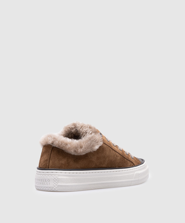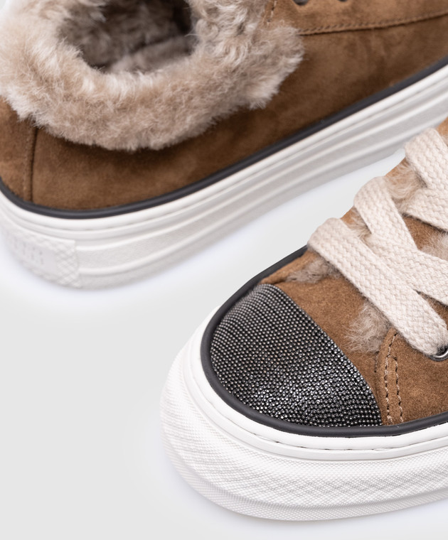 Коричневі замшеві кеди на хутрі з ланцюжком моніль