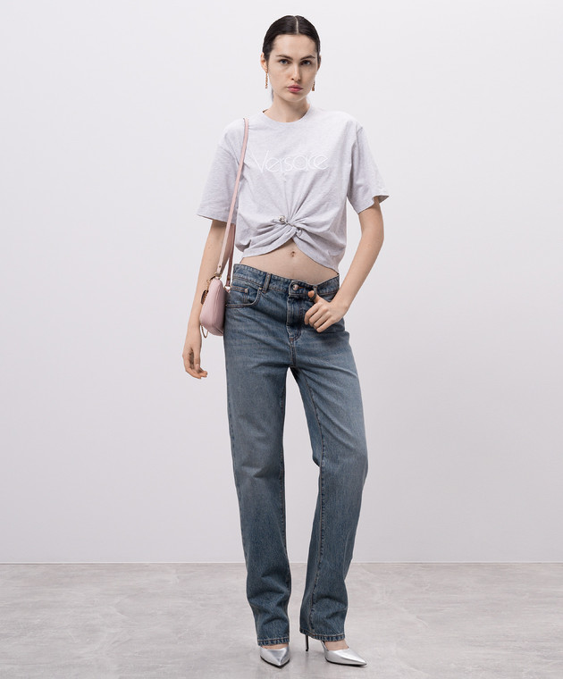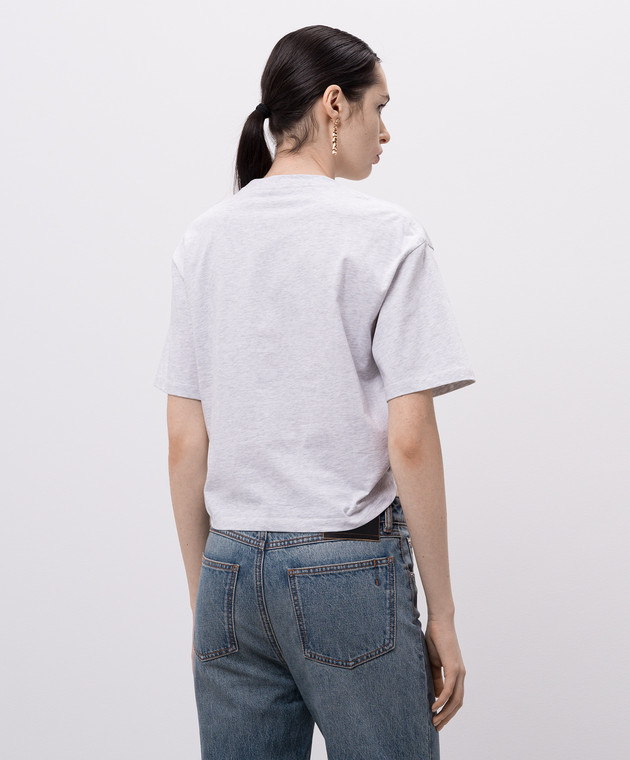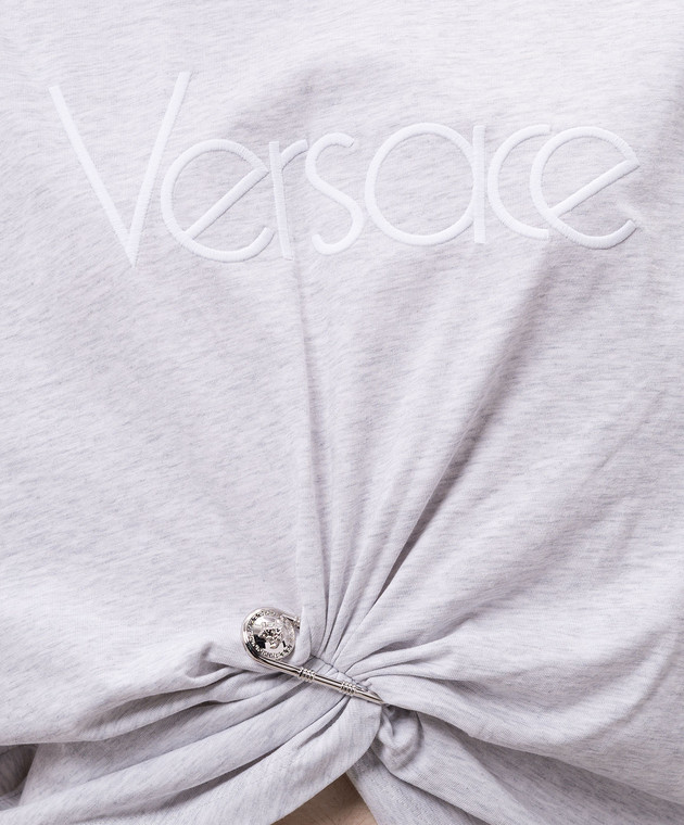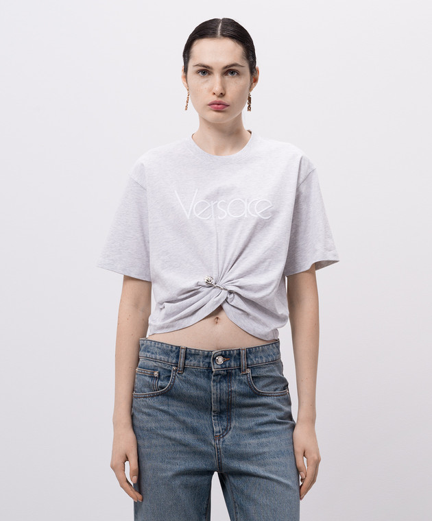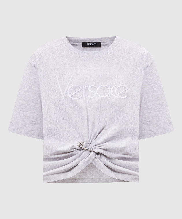 Сіра укорочена футболка з логотипом та брендовою шпилькою