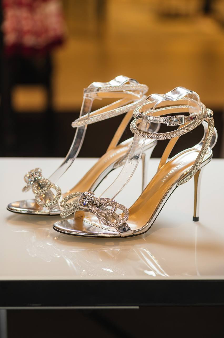 Сріблясті шкіряні босоніжки Double Bow з кристалами