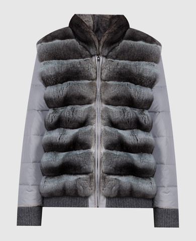 Сірий пуховик з хутром шиншили та ланцюжком моніль