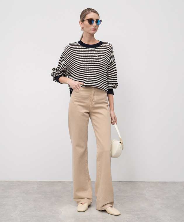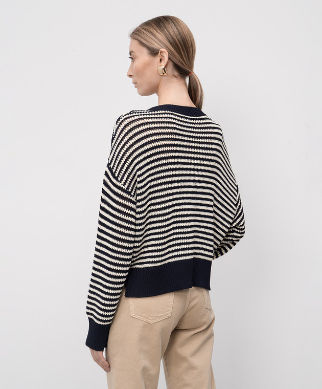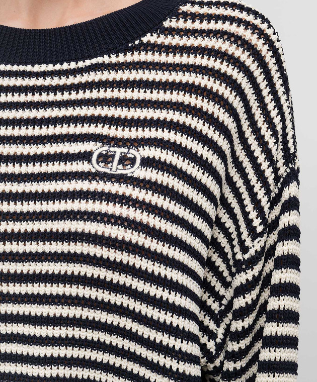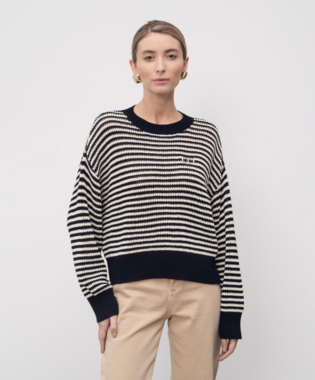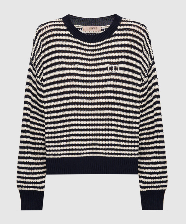 Синій светр в ажурний візерунок з вишивкою емблеми логотипа