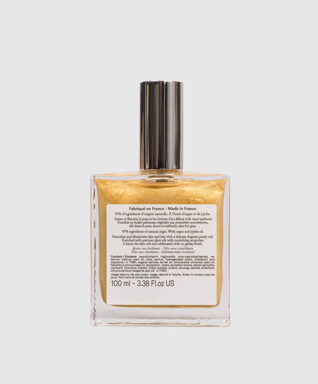 Олія збагачена дорогоцінними рослинними оліями, відомими своїми поживними властивостями, включаючи арганову та жожоба, вона сатинує та освітлює шкіру, залишаючи її м’якою та шовковистою, без жирної плівки.