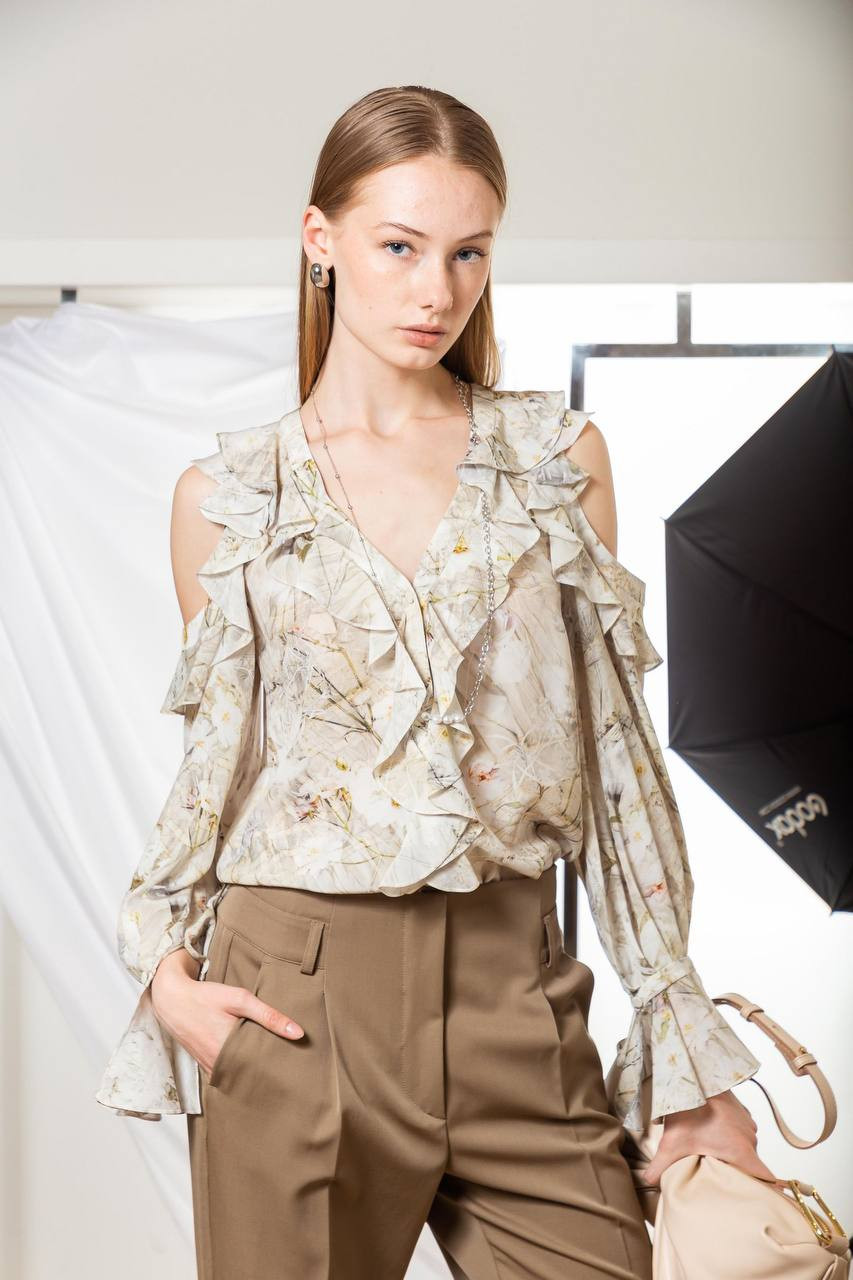 • Декор квітковий візерунок, фігурні вирізи на плечах, оборки, драпірування, фігурний низ