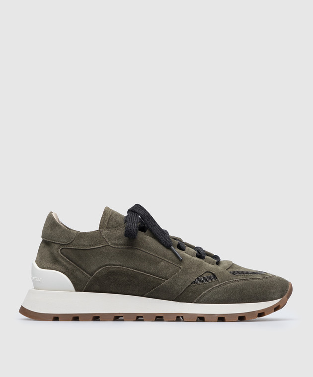 Темно-зелені замшеві кросівки з ланцюжком моніль
